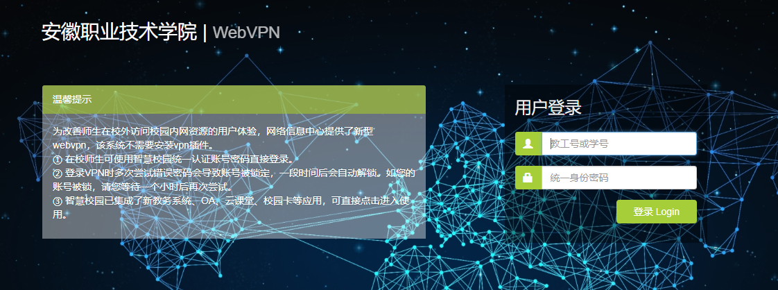 2.打开WebVPN页面,输入用户名和密码,用户名是学号,密码是身份证后六位(X用大写)。