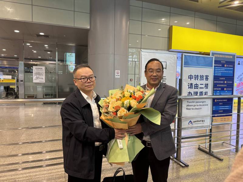 盛鹏院长亲切地跟队员们握手示意,祝贺师生们荣获金奖,并为凯旋归来的师生团队献上鲜花及亲笔签字的笔记本留存纪念。他关切的询问师生团队身体情况和竞赛过程,并对师生说道:“你们为安职争光,是学校的骄傲,感谢你们的努力,大家辛苦了。”最后,他勉励同学们要一如既往地认真学习、积极进取,期待着同学们捷报频传。现场的热烈氛围引来机场群众驻足围观,拍照录像记录这荣耀时刻。