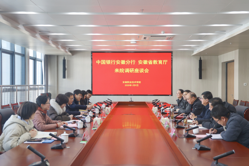 本网讯(教务处)1月9日上午,中国银行安徽省分行党委委员、副行长陈梓,安徽省教育厅高教处处长高原一行来院考察调研,学院党委书记李方泽,党委委员、副院长张智清,党委委员、副院长胡辉平接待了来宾一行,相关部门负责人参加了座谈会。会议由张智清主持。