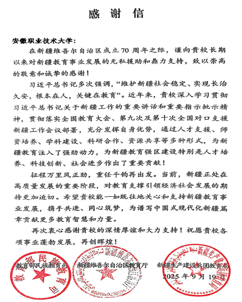 本网讯(教务处)在新疆维吾尔自治区成立70周年之际,教育部民族教育司、新疆维吾尔自治区教育厅与新疆生产建设兵团教育局联合向76net必赢线路检测中心发来感谢信,信中对必赢长期以来支持新疆教育事业发展表示肯定和感谢。