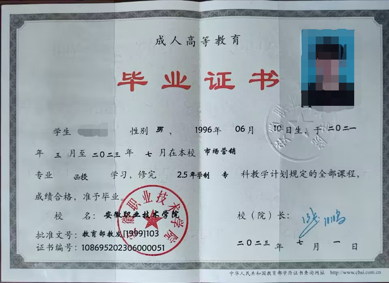 学生学习期满,完成教学计划规定的全部课程,成绩合格,由安徽职业技术学院颁发教育部统一电子注册的成人高等教育毕业证书,属于国民教育系列学历证书。