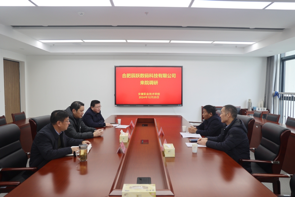 12月25日,合肥辰跃数码科技有限公司朱同才、汪东明来我院开展调研交流。学院党委委员、纪委书记李荣富,安徽职业技术学院教育发展基金会秘书长林葆春,相关职能部门负责人参加座谈会,会议由办公室负责人主持。