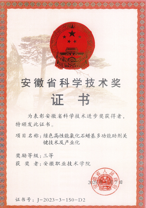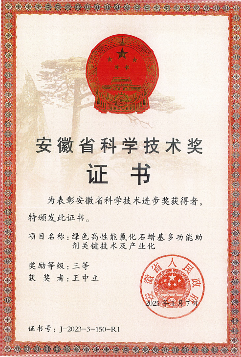 近日,2025年度安徽省科学技术奖获奖名单正式公布,由学院王中立副教授作为第一完成人,联合安徽星鑫材料科技股份有限公司等企业院校共同申报的《绿色高性能氯化石蜡基多功能助剂关键技术及产业化》项目,喜获安徽省科学技术奖三等奖。这一殊荣不仅是对学院产学研协同创新成果的高度认可,也是对学院坚持科技创新、服务国家发展战略的充分肯定。