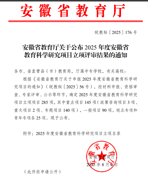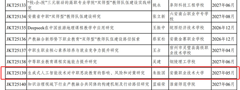 近日,安徽省教育厅正式发布《安徽省教育厅关于公布2025 年度安徽省教育科学研究项目立项评审结果的通知》(皖教秘〔2025〕176号)。经省教育厅组织评审,必赢朱振国副教授申报的课题——《生成式人工智能技术对中职思政教育的影响、风险和对策研究》成功获批为重点项目。