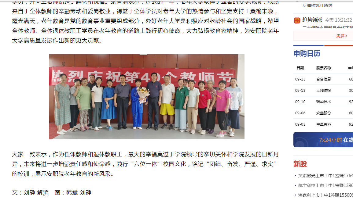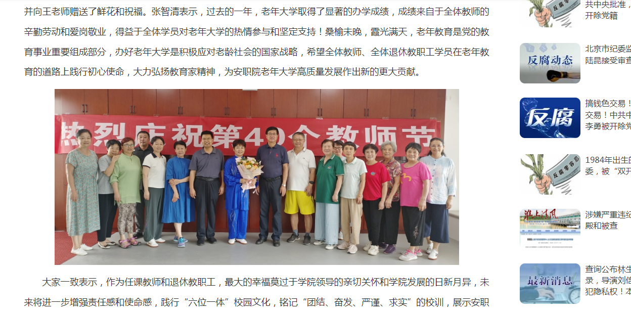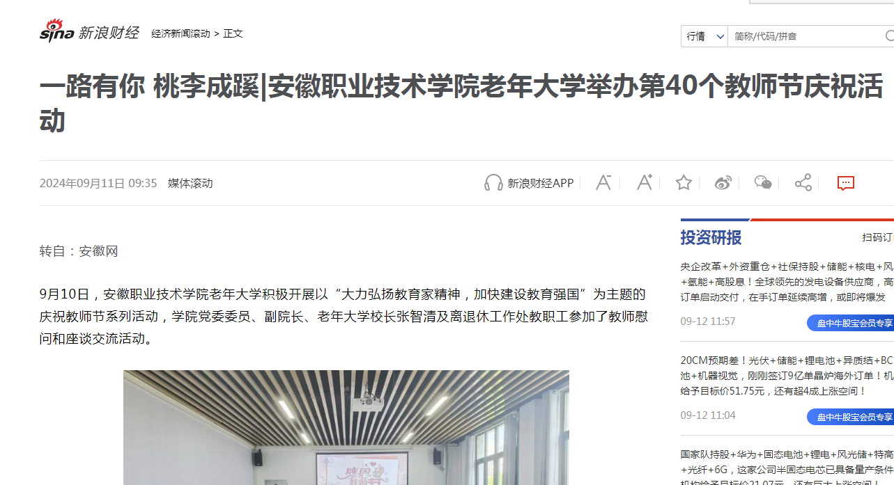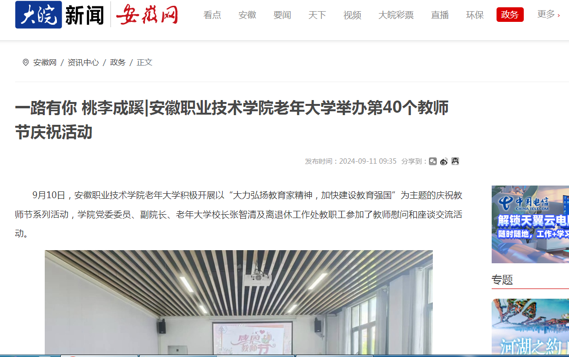 9月10日。我院老年大学举办庆祝第40个教师节系列活动,该活动对落实全国教育大会精神,弘扬尊师重教传统产生了积极的影响,本次活动新闻在“安徽职业技术学院网”发布以后,“新浪网”、“安徽网”均进行了转载。