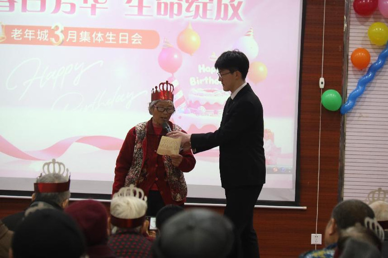 除了文艺表演,志愿者们还与老人进行了趣味互动游戏。猜歌名、击鼓传花等环节让现场笑声不断,老人们积极参与,现场其乐融融。活动尾声,志愿者们为每位老人送上了精心准备的暖心礼包,包含保暖围巾、健康手册等,并送上真挚的祝福:“愿您健康长寿,天天开心!”