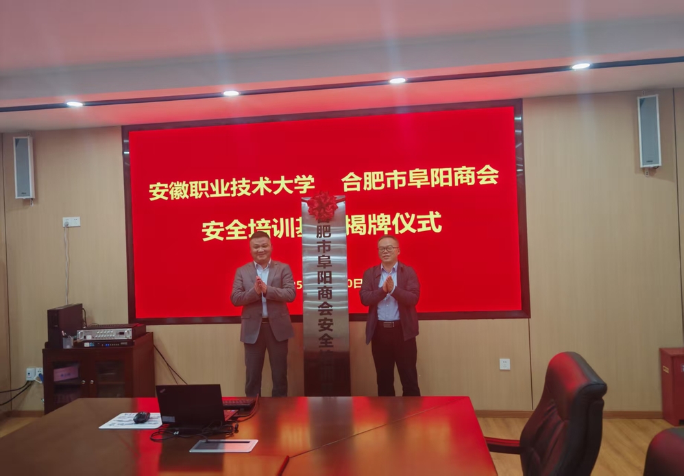 与会双方就进一步深化产教融合、校企合作,创新人才培养模式,探索党建引领下协同育人的新路径进行了深入交流。在与会人员的共同见证下,盛鹏与张之伟携手为合肥市阜阳商会安全培训基地隆重揭牌。会后,来宾一行参观了校园及安全生产实训中心并合影留念。