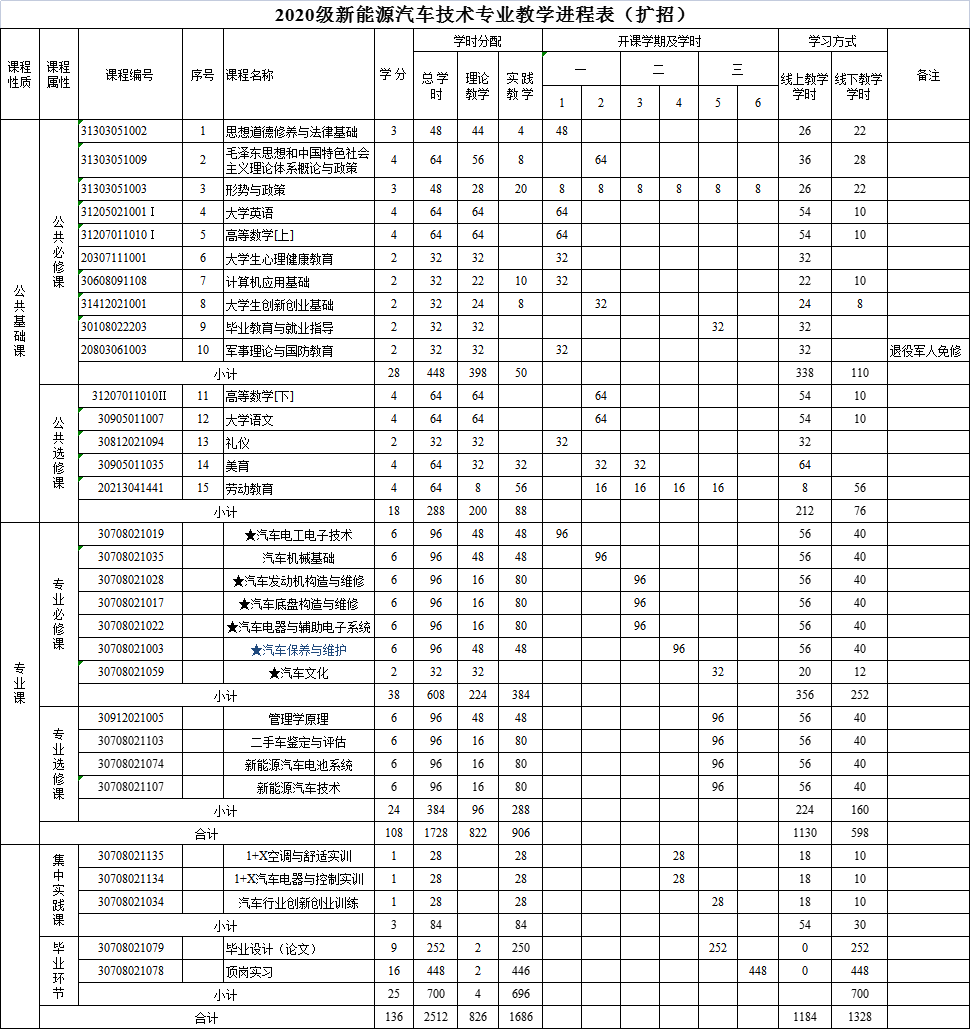 2 | 汽车发动机构造与维修 | 本课程是新能源汽车技术专业的专业基础课,主要讲授和培养现代汽车发动机构造、工作原理、故障诊断、与排除等方面的知识与技能。通过对课程的学习与训练,使学生具备现代汽车发动机的构造与工作原理、发动机的性能指标、维修基本方法、发动机常见故障的原因、特点及诊断分析方法方面的知识。 | 多媒体教室+实训室,云课堂混合教学 |