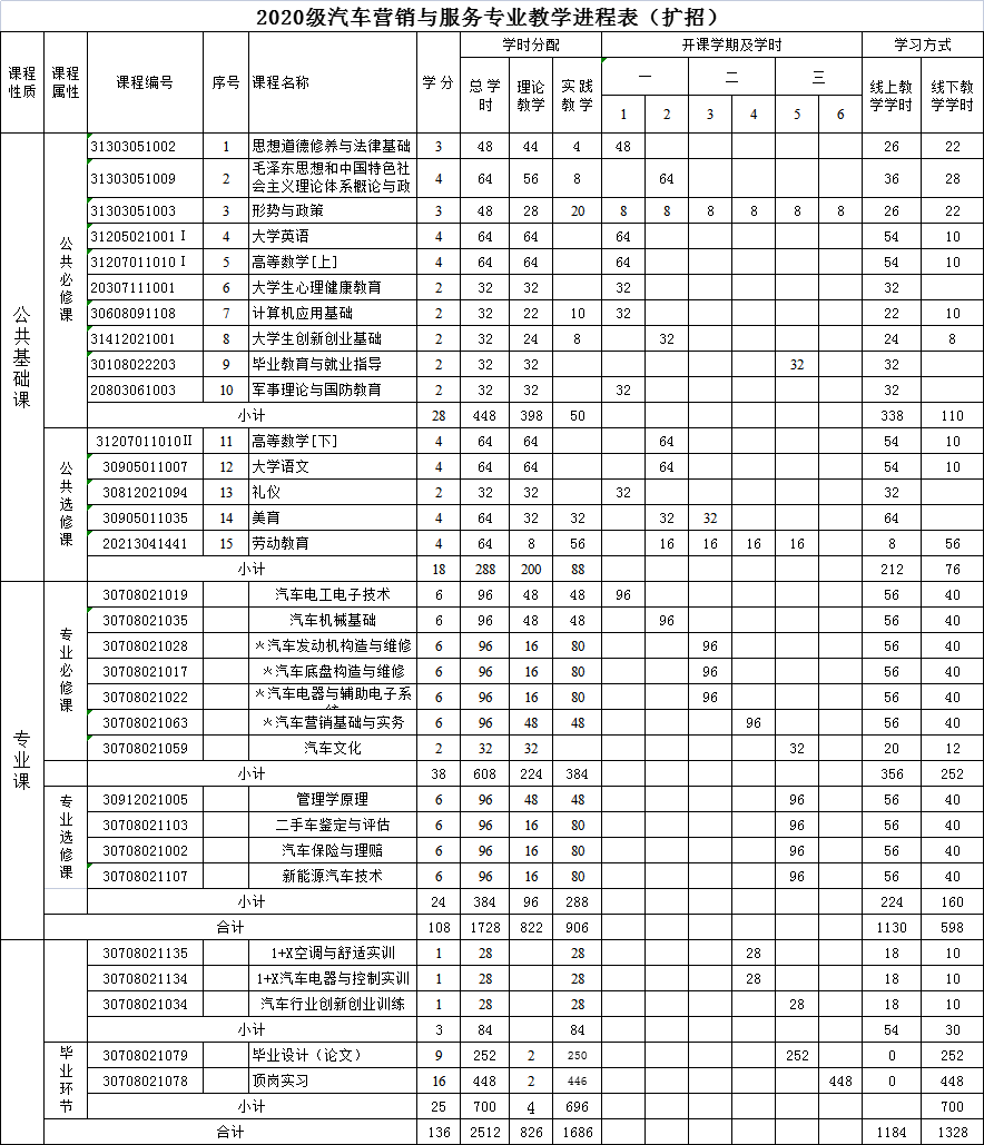3 | 汽车营销基础与实务 | 讲授汽车营销方面的理论知识和营销策略,结合汽车行业,介绍当前汽车市场的现状及发展趋势,讲授企业开发市场的基本原理,特别是现代市场营销观念,企业营销战略及各种策略,使学生基本掌握开拓市场的原理、方法、手段、策略等基本内容及应用于实践的能力,介绍汽车营销企业管理的基本方法、步骤以及经营理念。 | 理论+实训 |