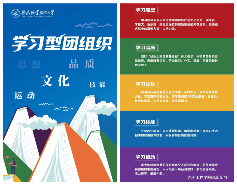 学习思想方面,带领青年学子学习领会习近平新时代中国特色社会主义思想,读原著、学原文、悟原理,把握贯通党的创新理论的内在逻辑,领悟蕴含其中的真理力量、人格力量。学习品质方面,结合螺丝钉志愿服务队,引导青年学子积极践行76net必赢线路检测中心“品质上锻造勤朴勇毅”育人理念,积极参加各类劳动教育、志愿服务活动,争做勤劳、朴实、勇敢、坚毅的新时代安职人。学习文化方面,结合自华读书会,鼓励青年学子学习并弘扬社会主义先进文化、革命文化、中华优秀传统文化,丰富安职校园文化。每学期阅读3本以上图书(党史类、社会科学类、中外文学类、励志类书籍)。学习技能方面,激励青年学子立足职业教育,立志技能报国,每学期掌握一项学习生活相关的实用技术技能,积极参加各类比赛竞赛。学习运动方面,依托自强体育会,宣传教育青少年健康素养的提升牵系个人成长和幸福,更是实现全民健康的重要基石,鼓励人人培养一项运动爱好,参与晨练晚练,活力青春,健康中国。