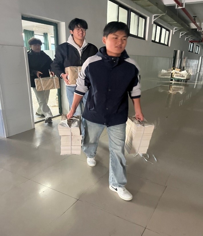 本次劳动实践课程采用“双组协作”模式。在搬书一线任务中,汽车工程学院辅导员王婉芹老师全程统筹第一组学生,强调安全规范与效率要求,并亲自参与搬运工作,按中图分类号整理书籍,将博雅楼108教室约万册的书籍搬运至109教室;在图文信息中心8楼,图书馆老师带领第二组学生挑选符合专业需求的书籍搬运至博雅楼101教室。经过1.5小时的通力协作,两组任务均圆满完成,书籍摆放整齐有序。挑书、搬书结束后,韩主任结合工作实例进一步向学生阐述劳动教育的内涵,教导学生认真负责的态度是未来步入职场最珍贵的名片。