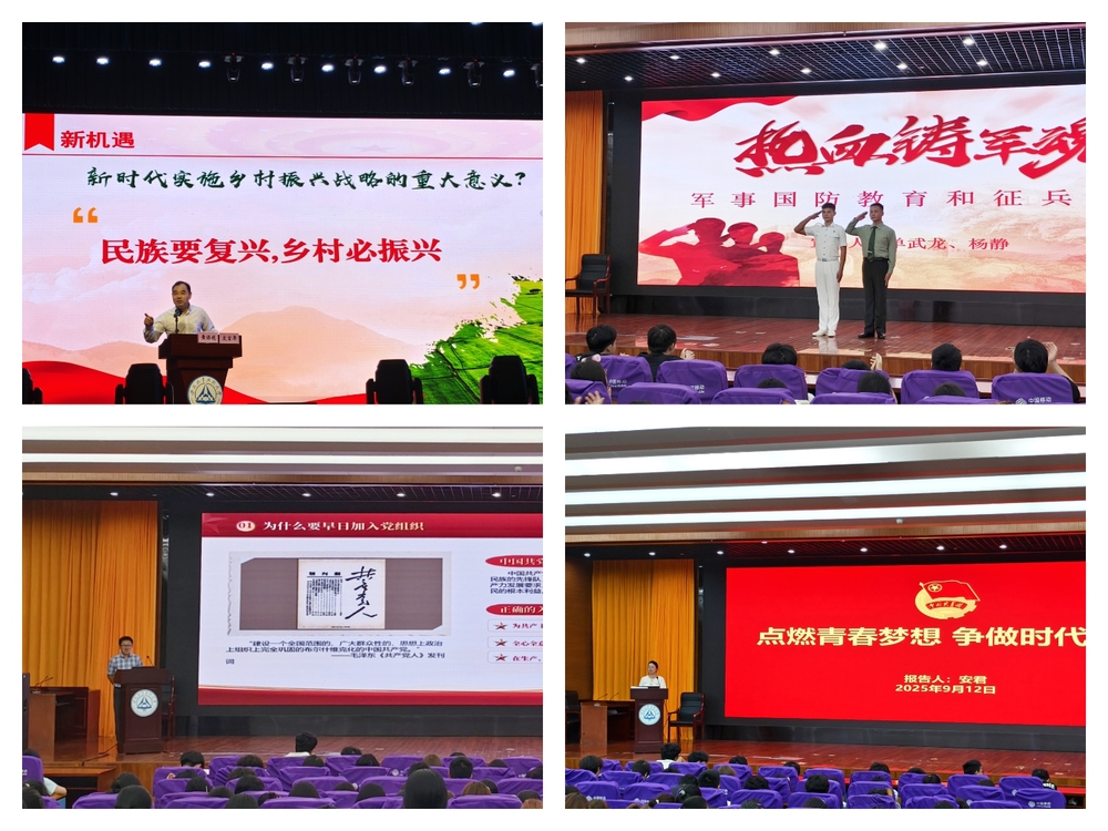 学院高度重视新生的理想信念教育。9月12日,组织开展国防教育和征兵宣传活动,迷彩先锋社成员、旅游2422班单武龙同学、文创2421班杨静同学结合九三阅兵历史与自身军旅经历,激发新生的家国情怀。同日举办的新生入党入团启蒙教育,由组织员和团总支书记共同主讲,为新生开启政治生涯第一课。此外,与校团委共同主办“安职大讲堂”秋季开学第一讲,邀请岸香农文旅创新产业学院院长黄保锁作专题讲座,将爱国主义教育与理想信念引导相结合,推动新生将个人理想融入国家发展与文旅产业建设。