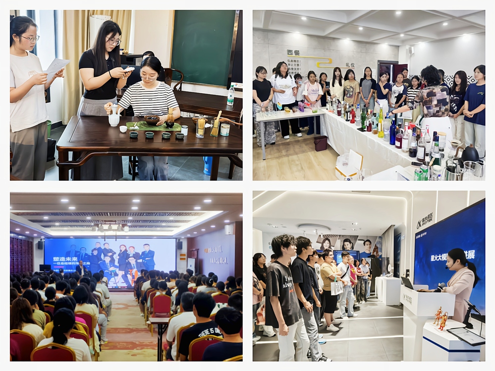 学院创新采用“专业展示+榜样分享+企业访学+名家讲座”模式,全方位展示专业特色。各专业教研室负责人详细解读培养方案,同时通过鸡尾酒调制、茶艺表演等特色活动具象化专业魅力。“学长学姐说”环节邀请优秀在校生、毕业生分享实践工作经验,为新生提供朋辈视角的专业认知。学院还组织企业实地参访,邀请企业高管开展行业前沿分享,让新生直观感知行业动态,构建“理论—实践—规划”的专业认知闭环,帮助新生明晰职业发展方向。