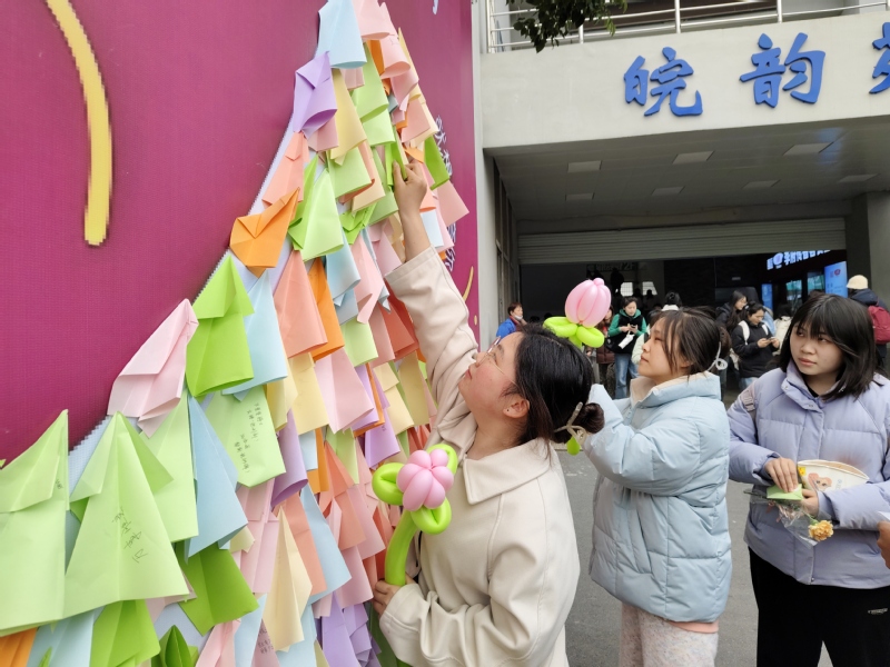活动现场,五彩卡纸如春日繁花般铺展。同学们纷纷来到志愿者身边,领取卡纸后,或沉思、或浅笑,将心底对女性长辈、朋友、师长的真挚祝福凝于笔端。一笔一划,皆是敬意;一字一句,满含温情。书写完毕,大家精心折成纸飞机,轻轻放置在“夸夸墙”上。一时间,“夸夸墙”的纸飞机错落镶嵌,为“她力量”点赞,构成一幅动人画面。学院贴心为每一位参与活动的同学送上娇艳鲜花,让爱与祝福在传递中升温,现场气氛热烈非凡,欢声笑语不断。