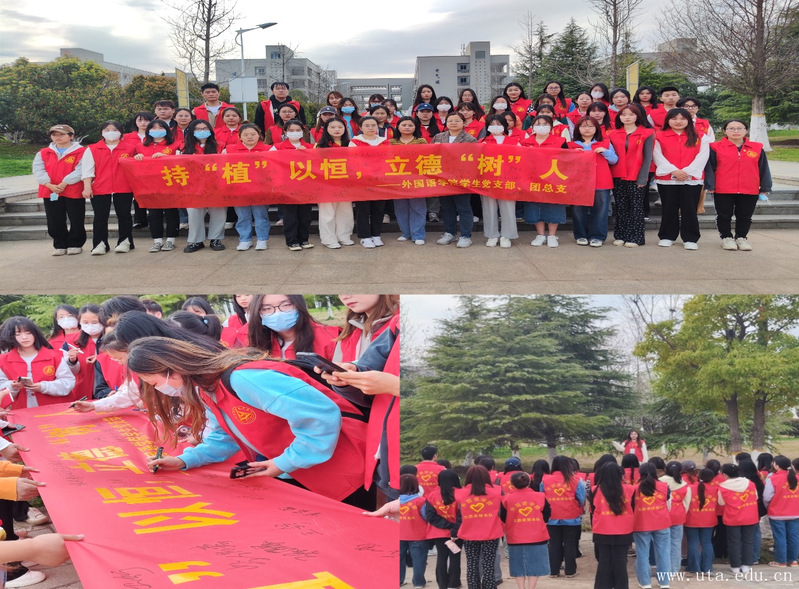 为深入学习贯彻党的二十大精神,倡导绿色发展生态文明理念, 3月10日下午,外国语学院学生党支部、团总支联合举办“持‘植’以恒 立德‘树’人”主题教育实践活动。通过志愿服务、科普知识讲解、绿色宣讲、倡议书、承诺签名等活动环节,呼吁同学们要牢牢认识生态文明的重要性,自觉树立和践行“绿水青山就是金山银山”的理念,坚持“人与自然和谐共生”的基本原则。