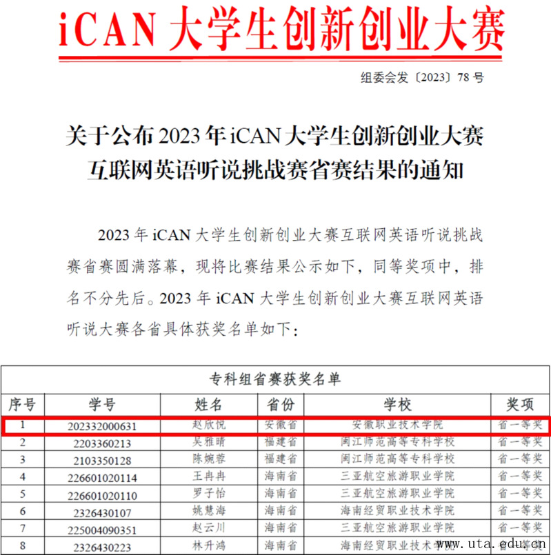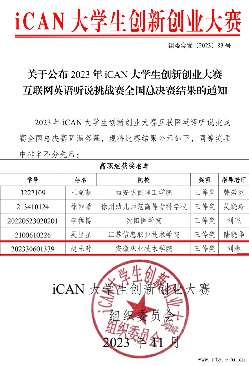 近日,由中国信息协会和全国高等学校大学外语教学研究会联合主办的2023年iCAN大学生创新创业大赛互联网英语听说挑战赛全国总决赛在江苏南京东南大学(九龙湖校区)圆满落下帷幕。学院参赛选手表现优异,外国语学院刘琳老师指导的国际2321班赵未时和金融2322班赵欣悦分别荣获国赛三等奖和省赛一等奖。