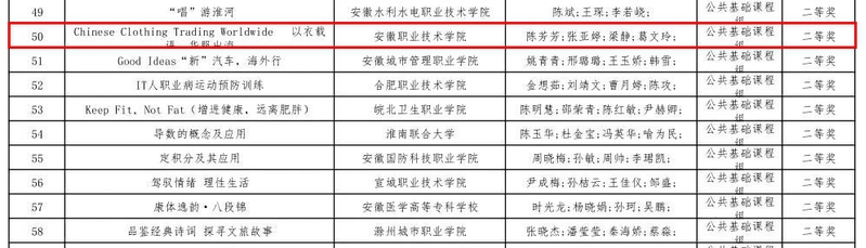 近日,由省教育厅举办的2024年安徽省高等职业院校教学能力大赛结果正式揭晓。本届教学能力大赛共收到全省64所院校报送的430件作品。我院陈芳芳、张亚婷、梁静、葛文玲教师团队精心打磨的参赛作品Chinese Cloting Trading Worldwide(《以衣载语,华服出海》)在众多作品中脱颖而出,获得公共基础课程组二等奖。
