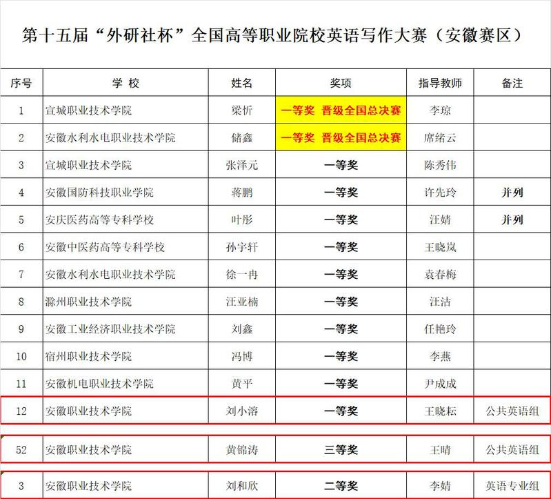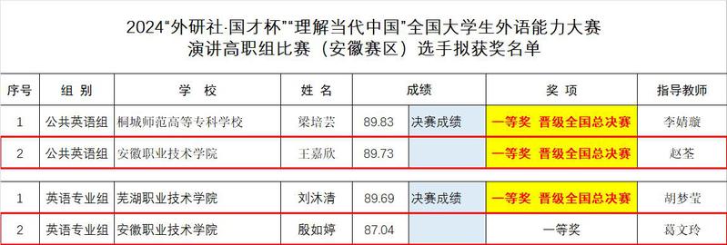 本网讯(外国语学院)近日,安徽教育厅网站公示了2024年9-11月安徽省大学生学科和技能竞赛部分赛事拟获奖名单,学院在2024“外研社杯”全国高职高专院校职场英语挑战赛(安徽赛区)英语演讲和写作两大赛项中共获历史最好成绩:一等奖3项、二等奖1项和三等奖1项。其中在演讲赛项中,媒体2322班王嘉欣和英语2321班殷如婷分获非专业组和专业组一等奖;写作赛项中,媒体2322班刘小溶获非专业组一等奖,英语2321班刘和欣(专业组)和网络2322班黄锦涛(非专业组)分别获得二等奖和三等奖,此次参赛取得三大突破。