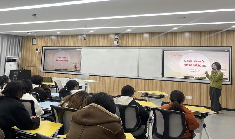 李婧带领同学们学习了New Year's Resolutions(新年决心)的背景、含义及制定方法,并引导同学们写出自己的新年目标。最后,同学们互相分享了自己的新年目标,并表达了实现目标的决心。