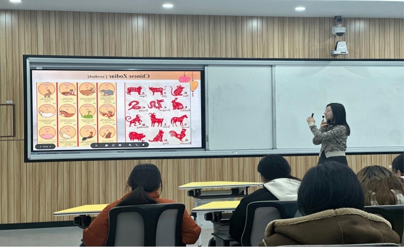徐睿通过视听学习和小组讨论的方式,教授同学们如何用英文讲好中国新年故事(如春节起源、相关习俗、中国十二生肖),如何在即将到来的蛇年用英文拜年,并就“春节”的翻译展开讨论。