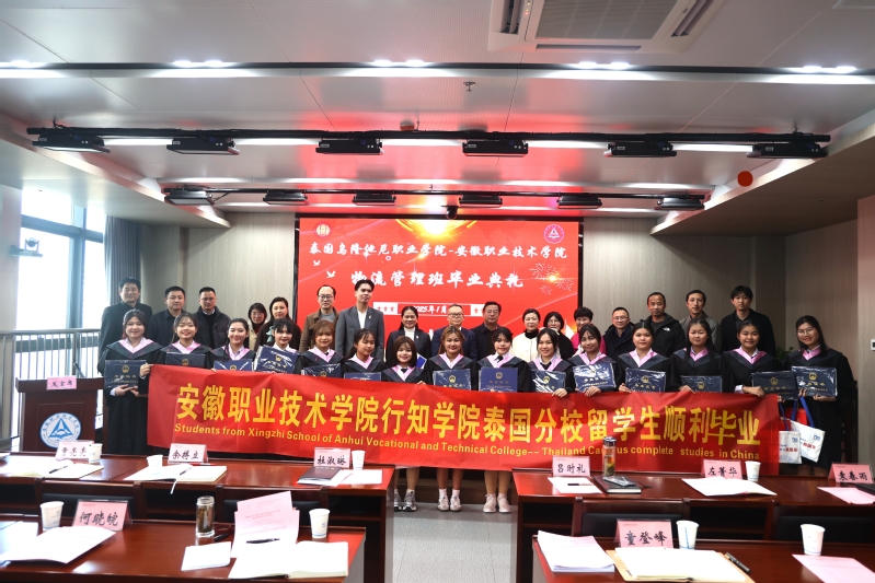 本网讯(外国语学院 现代商务学院)近日,安徽职业技术学院行知学院-泰国分校第二届留学生顺利毕业,泰国乌隆他尼职业学院校长马纳萨努·拉特里旺应邀参加留学生毕业典礼。院党委书记李方泽,党委副书记、院长盛鹏,党委委员、纪委书记李荣富,相关职能部门、二级学院负责人,教师代表以及15名物流管理专业泰国留学生参加了相关活动。