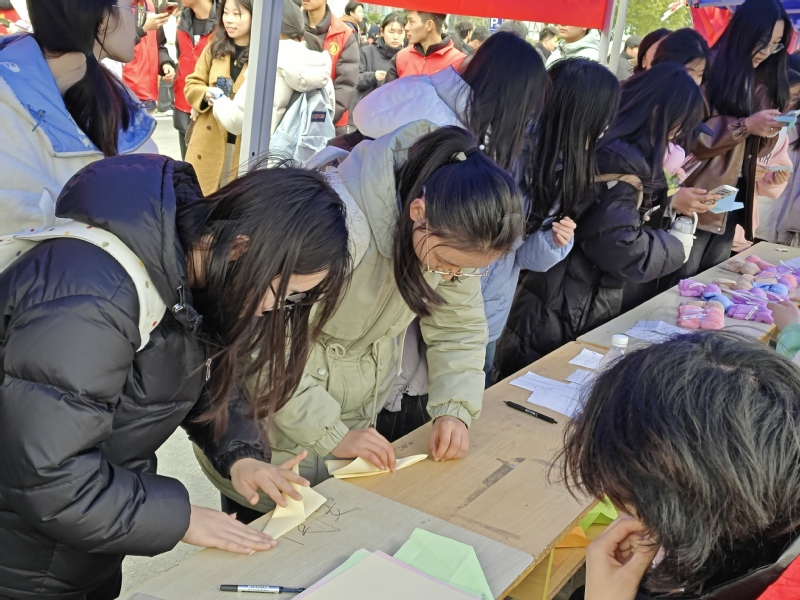 活动现场,五彩卡纸如春日繁花般铺展。同学们纷纷来到志愿者身边,领取卡纸后,或沉思、或浅笑,将心底对女性长辈、朋友、师长的真挚祝福凝于笔端。一笔一划,皆是敬意;一字一句,满含温情。书写完毕,大家精心折成纸飞机,轻轻放置在“夸夸墙”上。一时间,“夸夸墙”的纸飞机错落镶嵌,为“她力量”点赞,构成一幅动人画面。学院贴心为每一位参与活动的同学送上娇艳鲜花,让爱与祝福在传递中升温,现场气氛热烈非凡,欢声笑语不断。