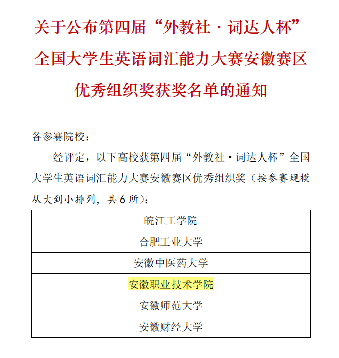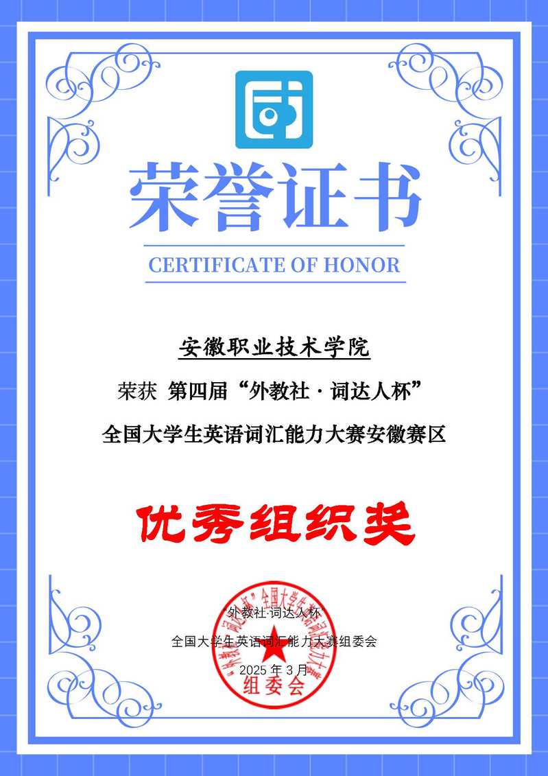 本网讯(外国语学院)为推动大学生深入学习习近平新时代中国特色社会主义思想,深入贯彻落实党的二十大精神,推动学生英语词汇学习和测试手段的创新,提高英语智慧教学水平,近日,外国语学院和校团委外语协会联合举办第五届“外教社·词达人杯”全国大学生英语词汇能力大赛校赛。同时,学院荣获第四届“外教社·词达人杯”全国大学生英语词汇能力大赛安徽赛区优秀组织奖,全省仅6所高校获此殊荣。