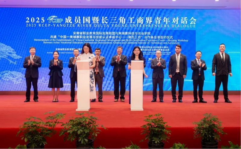 在柬埔寨劳动与职业培训部和安徽省教育发展基金会领导的共同见证下,安徽省职业教育国际发展联盟与柬埔寨技术和农业学院签署共建“中国-柬埔寨职业发展与技能认证卓越中心——徽匠工坊”备忘录,安徽职业技术学院等7所职业院校参与合作共建,开展职教出海工作。