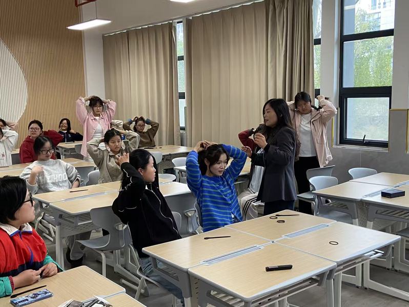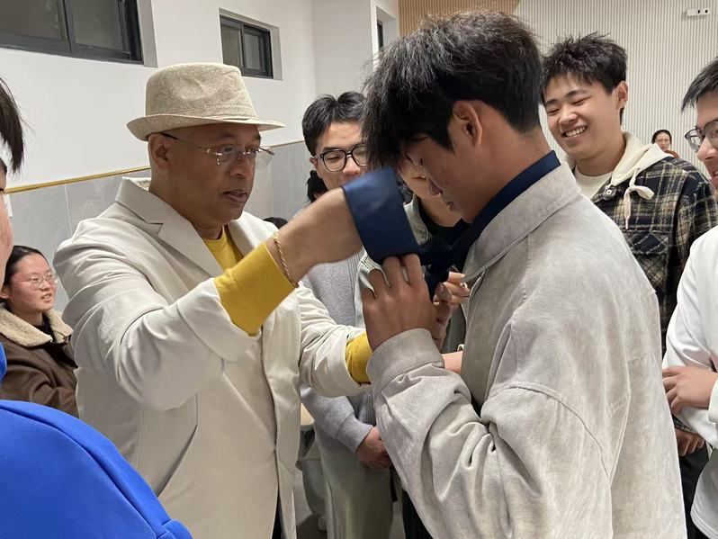 在备受期待的实践环节,两位教师分别指导学生进行实操练习。Wallace教授逐步拆解了经典双温莎结的领带打法,并一对一指导学生完成实操,锤炼细节。张亚婷老师则指导学生进行盘发,将传统发簪与现代发型相结合,指导学生打造出优雅干练的职业发型。双线并行的互动模式,极大提升了学生的参与度与体验感,现场学习气氛热烈,教学成效显著。