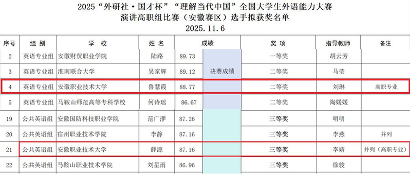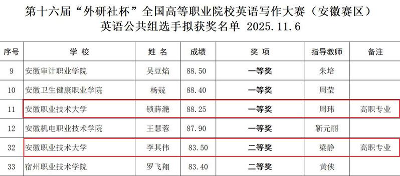 本网讯(外国语学院)近日,2025“外研社杯”全国高职高专院校职场英语挑战赛 (安徽赛区)落下帷幕。我校参赛选手表现优秀,药品2321班锁薛滟(指导教师:周玮)、机电2426班李其伟(指导教师:梁静)分别获得英语写作赛项公共英语组一等奖、二等奖,商务英语2421班鲁慧霞(指导教师:刘琳)、电子2422班薛源(指导教师:李婧)分别获得英语演讲赛项专业组二等奖、公共英语组三等奖。
