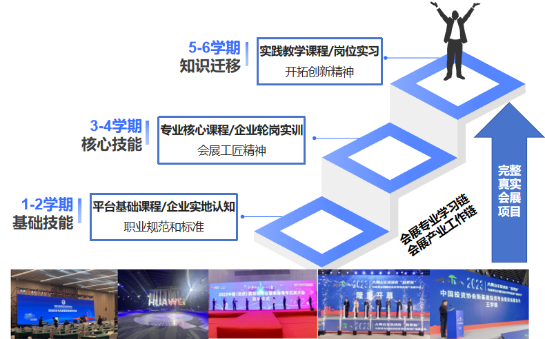 会展专业基于工作过程导向课程体系改革的基础上,借鉴德国“双元制”,由校企共同设计实施“一主线、双链条、三阶段、多项目”人才培养模式。围绕“立德树人”的根本任务为教育主线(“一主线”),与会展龙头企业深度合作,整合会展专业学习链与会展产业工作链(“双链条”),根据项目工作流程和学生认知规律,设置“专业基础课程/企业实地认知——专业核心课程/企业轮岗实训——实践教学课程/岗位实习”专业课程体系(“三阶段”),承接多项服务区域经济发展的完整真实会展项目作为教学载体,包括在合肥祥源花世界举办的“合肥斑马音乐节”、在国家会展中心举办的“首届中国县域经济投资高峰论坛”和“深圳重大交易平台推介会上海站”,在上海世博展览馆举办的“华为全联接大会”,在安庆会展中心举办的大黄山文旅城市“微更新”与和美乡村建设标识导视应用展品展示会,在合肥举办的世界制造业大会公众号运营模块等(“多项目”) ,根据安徽省大黄山建设规划部署,未来我们还将积极对接安徽省大黄山项目,为该项目会展产业发展模块提供智力支持。