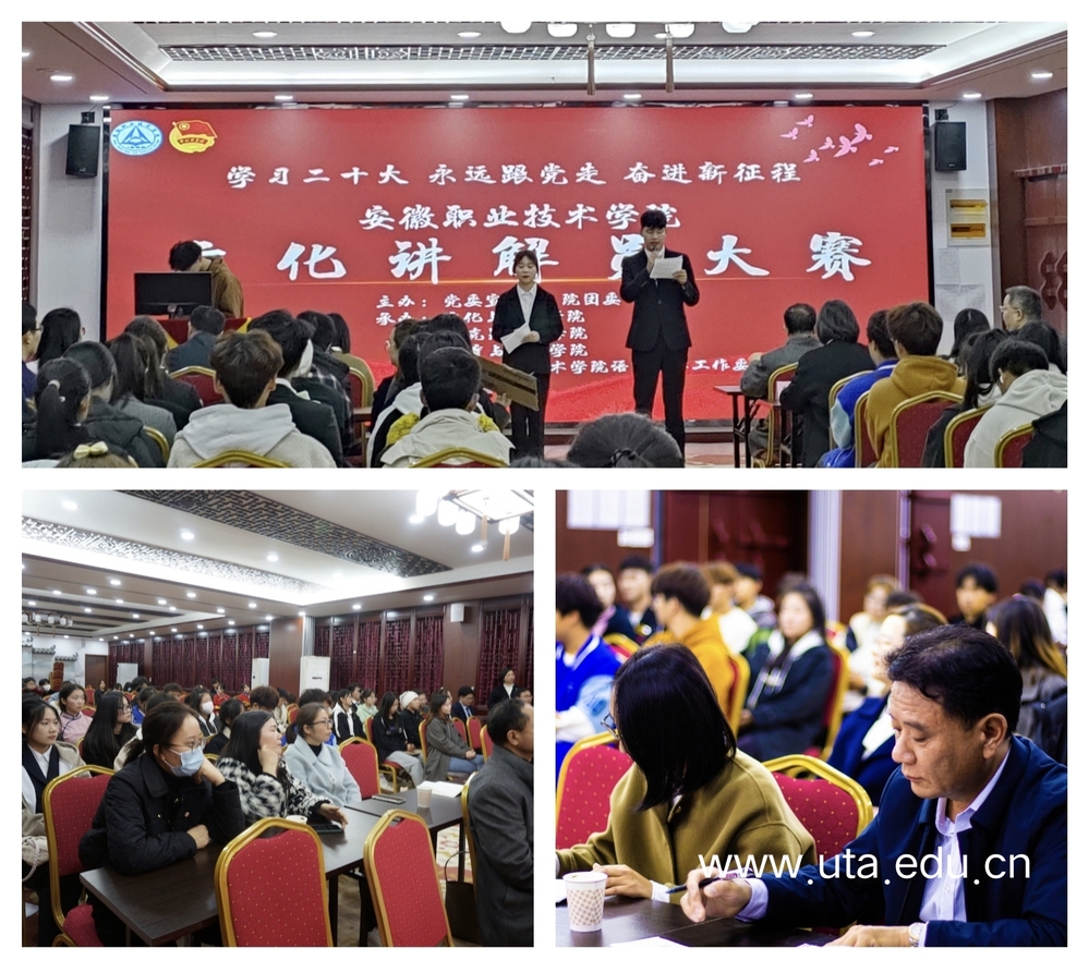 2022年11月23日,安徽职业技术学院“学习二十大 永远跟党走 奋进新征程”文化讲解员大赛圆满落幕。大赛由安徽职业技术学院党委宣传部、院团委主办,文化与旅游学院、马克思主义学院、体育健康学院、安徽职业技术学院语言文字工作委员会共同承办。党委办公室、行政办公室主任李瑞勇,党委宣传部副部长孙静,学生处副处长王曾,体育健康学院党总支书记张在腾,马克思主义学院组织员黄学文,文化与旅游学院文秘教研室、安徽职业技术学院语言文字工作委员会张徽到场指导并担任大赛评委,文化与旅游学院党总支副书记徐李莉、马克思主义学院团总支书记胡宏胜、文化与旅游学院团总支书记安君及指导老师出席了本次比赛。