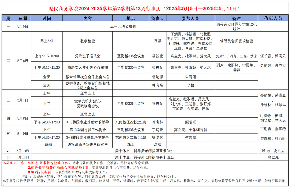 2024-2025学年第2学期第13周行事历