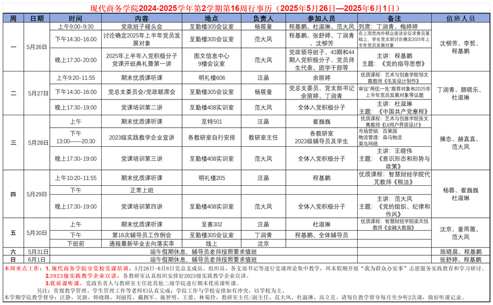 2024-2025学年第2学期第16周行事历
