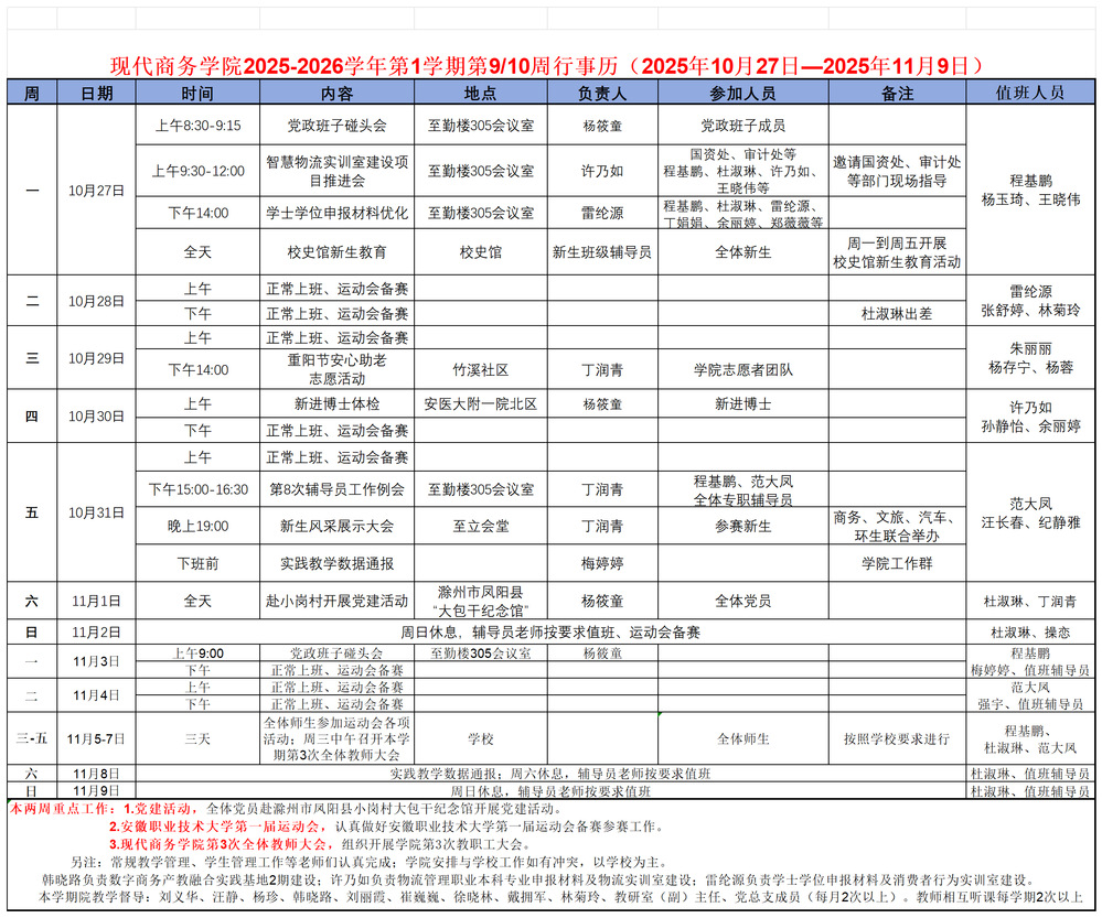 2025-2026学年第1学期第9-10周行事历