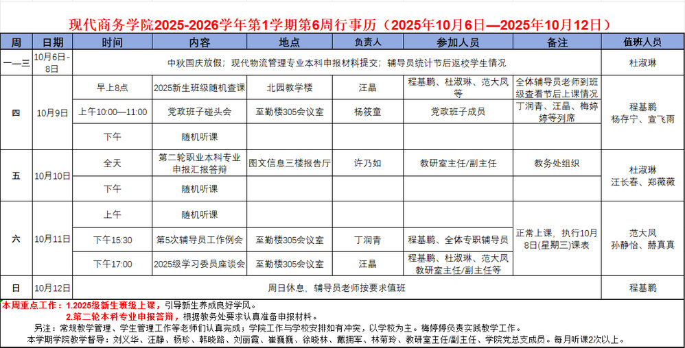 2025-2026学年第1学期第6周行事历