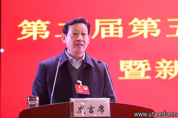 会上,党委副书记、校长孙敬华代表校领导班子向大会作了题为《不忘初心展现新作为  牢记使命共谱新篇章》的工作报告。报告全面总结了过去一年,学院在加强党的建设、提升办学治校水平、完善制度体系、深化内涵建设、提升服务管理等五个方面所取得的22项工作业绩。客观分析了新形势下学院发展面临的机遇和挑战,并明确了学院在2019年的工作重点:一要聚焦政治自觉,推动全面从严治党向纵深发展;二要聚焦立德树人,全面提升办学育人水平;三要聚焦“双特双高”,全力推进高水平大学建设;四要聚焦教学改革,不断推动教学内涵建设;五要聚焦开放办学,大力提升学院社会影响力;六要聚焦资源配置,进一步加强人才队伍建设;七要聚焦基本建设,进一步增强服务保障能力。他并号召全校教职工,以时不我待、只争朝夕的精神,落实落细今年主要任务部署,以昂扬的精神姿态和丰富的工作成果,向中华人民共和国成立70周年献礼。