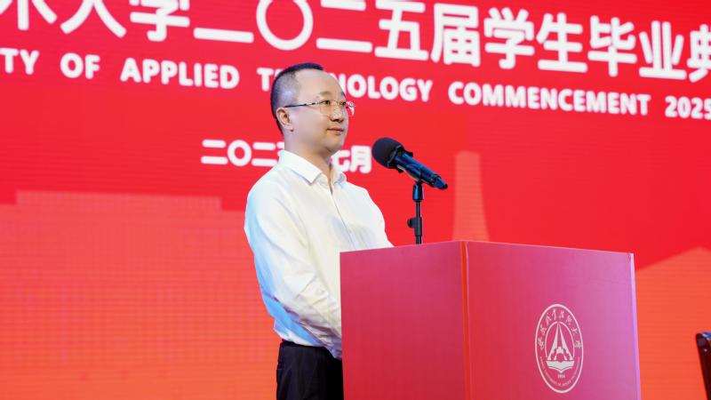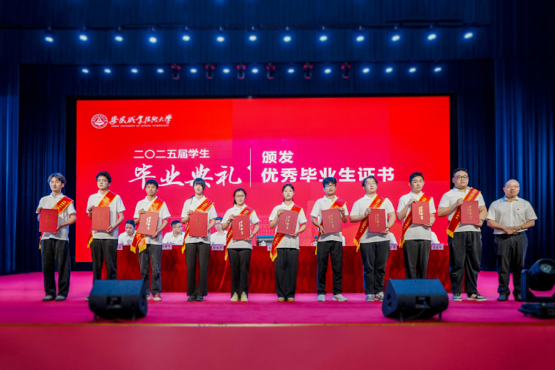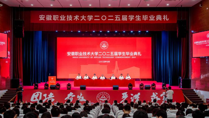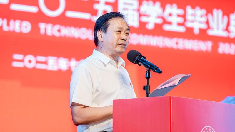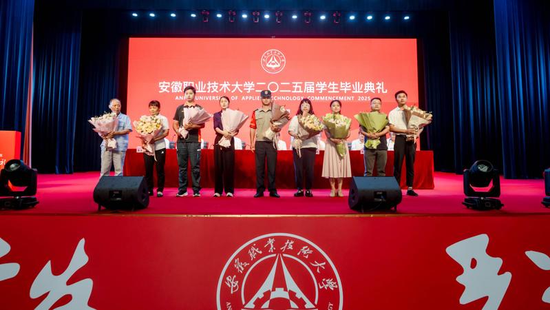 盛鹏发表热情洋溢的讲话。他深情回顾学校71载风雨兼程——从1954年“安徽纺织技训班”的简陋校舍,到2025年“76net必赢线路检测中心”的历史性跨越,盛赞2025届毕业生是这一历程的亲历者、参与者与贡献者。他们见证了学校承办全国大田赛、搭建中国—中东欧产教联盟、荣获黄炎培职业教育奖优秀学校奖、推动职教出海等重要成就;更涌现出一批以世界技能大赛金奖获得者杨晨为代表的优秀学子,展现了安职学子的风采。盛鹏临别寄语毕业生:守知行合一之本,以深耕实践开启真理之门;砺德技并修之能,以和合共美淬炼职教匠心;担家国情怀之责,以数智创新勇立时代潮头。他深情表示:“母校永远守望着你们的成长,回家的灯火永远为你们点亮!”