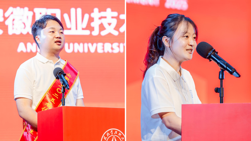 毕业生代表、计算机与信息技术学院杨晨深情回溯校园时光,感恩师长的悉心指导与同窗情谊,表示“严谨求实、团结奋发”的校训精神已融入血脉,将永葆“安职人”技能报国情怀。在校生代表、公共管理学院余淑婷分享了见证学校升格本科的澎湃自豪,誓言在母校这片育人沃土锤炼本领,传承安职精神。