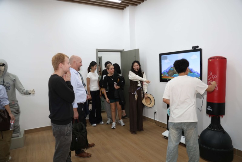 在心语协会成员的引导和讲解下,访问团依次参观了放松室、宣泄室、沙盘游戏室及团体活动室等,全面了解了心理健康教育中心的服务内容与运行机制。随后,师生们根据个人兴趣分组体验了不同功能室的活动与设备。在放松室与宣泄室,访问团通过体验VR虚拟放松系统、智能身心反馈系统、智能击打呐喊宣泄设备、音乐放松椅等,切身感受科技在情绪疏导与心理调适中的应用,学习如何借助沉浸式互动调节身心状态。在沙盘游戏室,心理健康教育中心教师通过讲解与带领体验相结合的方式,让访问团成员亲身体验沙盘游戏技术,深刻感受其以象征和创造进行内心探索的独特魅力。
