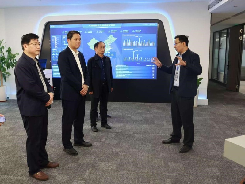 李荣富一行参观了中检天帷产品和服务展厅,详细了解中检天帷在网络安全合规治理细分领域的产品服务、市场布局和技术创新等情况。