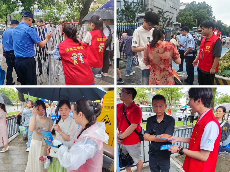 今年高考三天恰逢连绵阴雨,给护考活动带来了极大的难度。但恶劣的天气丝毫没有阻挡志愿者们的热情与决心。高考现场,大学生志愿者们身穿红马甲,坚守在考点入口两侧,为考生建立起绿色通道。他们冒雨配合交警维持交通秩序,进行安全疏导,确保接送考生的车辆顺畅、安全通行;与城管队员紧密合作,开展文明引导和秩序维护工作,提醒送考的家长保持秩序、降低声音,为考生营造了一个安静有序的外围环境。同时,他们还为等候的家长们提供了临时休息场地,全方位保障考生和家长的需求。现场也有不少家长在咨询学校首批本科招生情况,志愿者们耐心解答。在考生出场时,志愿者们以饱满的热情和甜美的笑容迎接考生,为其下一科考试加油打气。