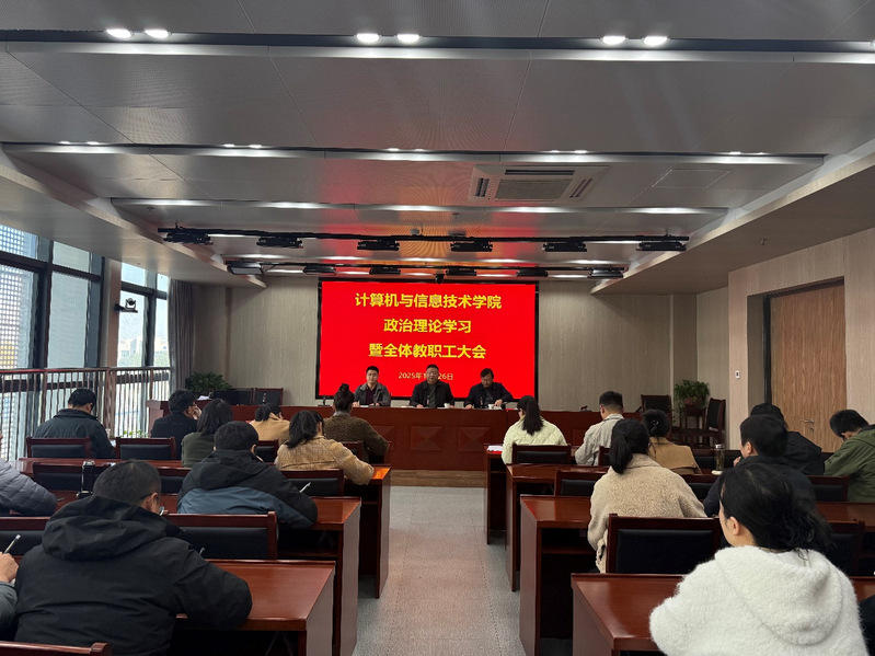 11月26日,计算机与信息技术学院在至公楼3楼视频会议室召开政治理论学习会暨全体教职工大会,会议由学院党总支书记周玉强主持,副院长胡继胜、黄如兵,党政秘书方杰及全体教职工参加。