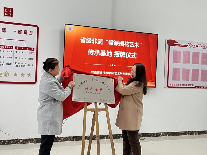 12 月4日,安徽省第六批非遗项目“徽派插花艺术”传承人付玉兰教授带领传承团队部分成员,在安徽职业技术学院艺术与创意学院举行传承基地授牌仪式。艺术与创意学院党总支书记左菁华、院长张文徽及人物形象专业全体教师参加此次活动。这也是徽派插花艺术在省内高职院校的第一个授牌基地。