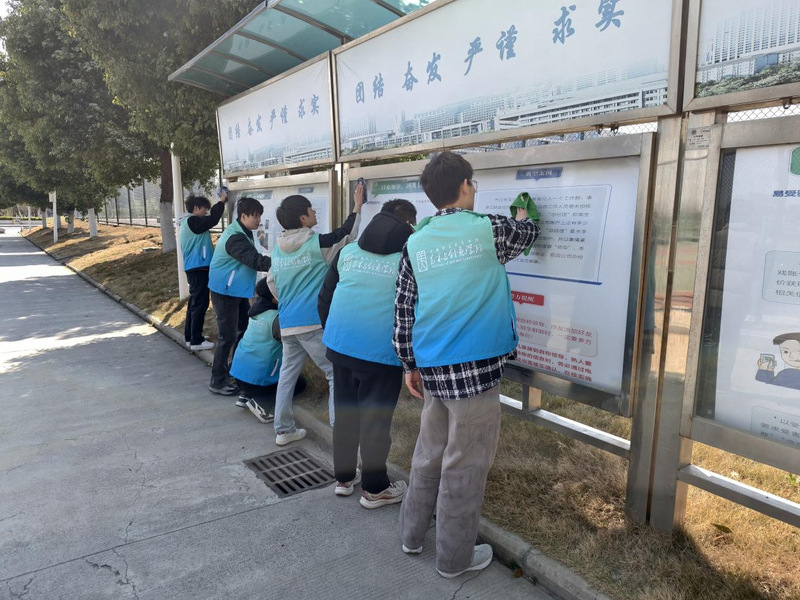 活动当天,志愿者们身着志愿服,携带水盆、抹布,按东区篮球场划分成小组,对东区食堂、操场等区域的宣传栏展开全面清洁。面对积灰、水渍等顽固污渍,同学们分工明确,有人负责用湿抹布擦除污垢,有人用干纸巾擦拭宣传栏表面。经过近一个小时的努力,原本蒙尘的宣传栏焕然一新,成为校园内一道亮丽的风景线。