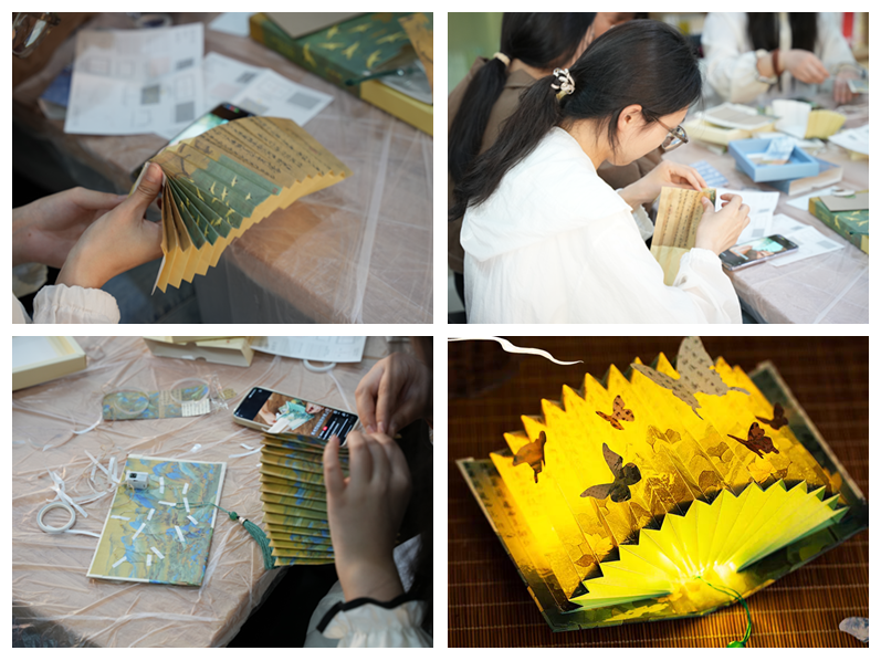 “创意书灯”制作区充满欢声笑语。学生用半透明的花纸硬纸板LED灯带,亲手折叠出蝴蝶、书体等造型的立体书灯。从纸张的粘贴到框架的搭建,再到灯带的安装,每一步都凝聚着大家的智慧与汗水。经过一番努力,一盏盏精美的书灯逐渐成形灯光亮起时,书灯上的图案投射出斑驳光影,宛如将春天的夜色装进了书本。