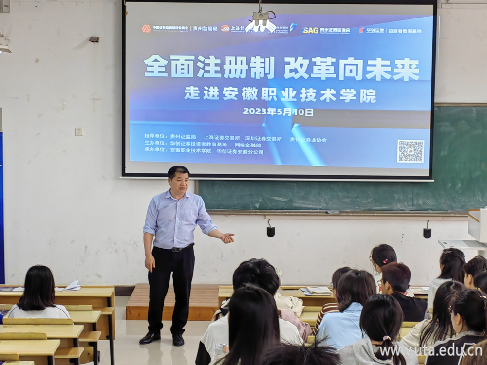 为拓宽同学们的行业视野,提升财商素养,加强同学们对非法证券活动的辨别能力,树立理性投资理念,510日下午,智慧财经学院在电教楼203开展“全面注册制,改革向未来”——华创证券“金融知识进校园“活动。华创证券有限责任公司安徽分公司总经理孙军、智慧财经学院院长刘玉杰、团总支书记钟静、专职辅导员程楚以及百余名学生代表参加了本次宣讲会,会议由刘玉杰主持。