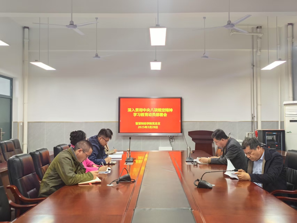 3月28日,智慧财经学院党总支召开深入贯彻中央八项规定精神学习教育动员部署会,学院党总支领导班子成员、组织员、各党支部书记参加会议,会议由党总支负责人汪洪斌主持。