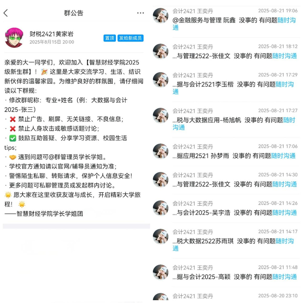 以心迎新,筑梦启航。迎新前夕,学院提前谋划、周密部署,组建了一支由2024级学生构成的“学长学姐团”志愿者队伍,建立线上新生咨询群,实时为新生答疑解惑。群内消息不断、温情满满,辅导员老师与志愿者协同配合,实行轮值答疑机制,确保信息响应及时、服务精准到位,为新生入校做好充分铺垫。