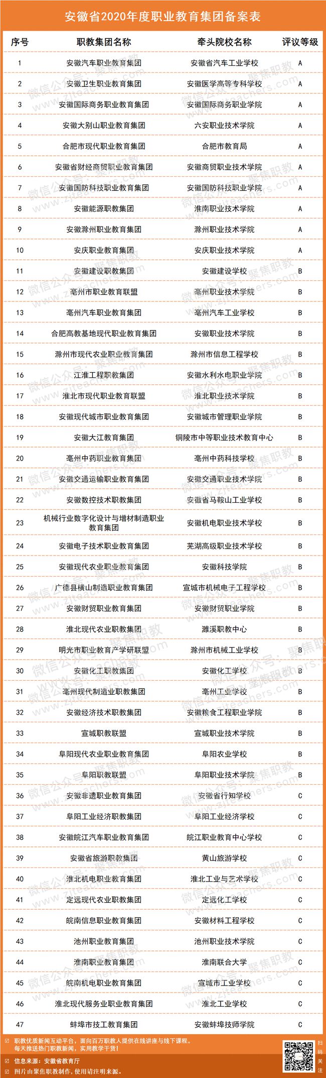 聚焦职教从安徽省教育厅获悉,为贯彻落实全国职业教育大会的精神、进一步规范安徽省职业教育集团的管理、完善职业教育集团运行机制、深化产教融合校企合作,省教育厅委托省职成教学会职业教育集团联盟,对各职教集团2020年度工作运行情况进行了综合评价。现将备案结果予以公布。